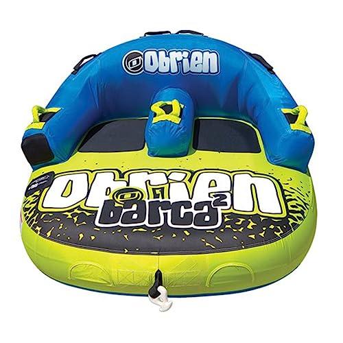"Get out on the water and ride the wild waves with a friend on the OBrien Barca 2 Inflatable 2-Person Towable Water Tube Raft. This towable tube for boating is ideal for adventure seekers new to the water sports scene. The twin design of this inflatable ride-on tube features 2 deep seats, backrests, armrests, and plenty of handholds with EVA knuckle guards. The seats provide a low center of gravity and increased stability when the waves get rough. Ride this 2-person inflatable chair chariot style or flip it around with the 2-way design so your riders can sit back and relax. The SofTec top deck helps ensure everyone's comfortable during their wild water ride. Constructed of durable 840D nylon, this boat accessory is built to last. 2 quick connect tow points make attaching the tube to the rope and boat easy. NOTE: Boat tow rope and air pump are not included. Have a blast on the water all summer long OBrien Barca 2 Kickback Inflatable 2-Person Rider Towable Boat Water Tube Raft. "