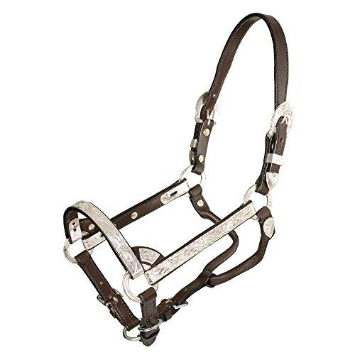 Royal King Silver Mini Show Halter Popular bright, cut edge, silver trim mounted on handsome bridle leather. Smoothed edges, doubled and stitched. Complete with lead. Color: Dark oil. Features: Bridle leather Bright, cut edge, silver trim Doubled and stitched Includes lead Specifations: Size Adjustable ( approximate) : Medium Mini: 30" - 32"; Crown: 12-14" Large Mini: 33" - 35"; Crown: 15-18" Note: measurements shown are height at withers.
